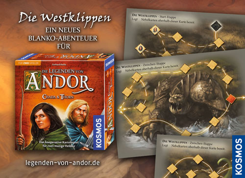 15.12.2015 - Zum neuen Kartenspiel Chada & Thorn von Gerhard Hecht, das in Michael Menzels Die Legenden von Andor-Welt spielt und wie dieses bei Kosmos erscheint, gibt es neues Blanko-Material zum kostenfreien Herunterladen, mit dem sich eigene Abenteuer gestalten lassen. Nach dem ersten Download Die Feuermoore ist gestern Die Westklippen hinzugekommen, inklusive neuer Landschaften und aller nötigen Spielsymbole. Selbst entwickelte Kreationen werden in der "Taverne" des Andor-Forums präsentiert.
