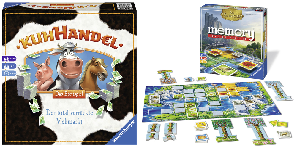 08.04.2016 - Erfolgreiche Marken auf nur eine Spielform zu beschränken, wäre liegen gelassenes Geld. Wohl auch deshalb verwandelte Ravensburger einen Karten- und einen Kärtchen-Dauerbrenner in Brettspiele: Kuhhandel - Das Brettspiel modifiziert das mittlerweile 30 Jahre alte Kartenspiel so, dass Rindviecher auf zehn verschiedenen Versteigerungen zur Wahl stehen. Auf einem neuen Markt können Spieler um den Wert ihrer Kühe feilschen. Außerdem holen sie frisches Geld aus einem Sparschwein, und an der Losbude entscheidet das Glück. Der Bauer, der zuerst ein Paar zeugungsfähige Tiere besitzt, darf seinen Hof etwa um Ferkel erweitern. Bei memory - Das Brettspiel: Die Entdecker müssen die Spieler die Tiere, Pflanzen und Gegenstände auf Kartenpaaren finden, die ein Sturm im Lande Merkuria durcheinandergewirbelt hat. Danach gilt es, die Paare an den richtigen Ort zu bringen, den Fisch zum Beispiel in den Fluss und den Hasen in den Wald. Richtig abgelegte Plättchen werden mit Baumstammteilen belohnt; Gewinner ist, wer am Ende den größten Baum vor sich liegen hat.
