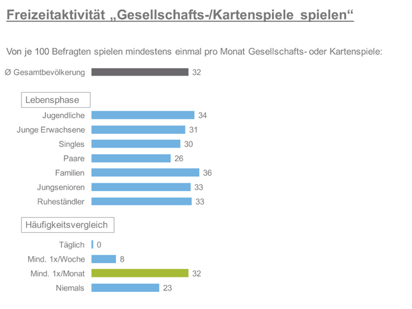 32 % der Deutschen spielten mindestens einmal pro Monat Brett- oder Kartenspiele. Im Durchschnitt aller Befragten spielten 23 % niemals Gesellschaftsspiele, und niemand spielte jeden Tag. 8 % setzten sich mindestens einmal pro Woche an den Spieletisch, 32 % mindestens einmal im Monat. Dieses Hobby verteilte sich relativ gleichmäßig über alle Bevölkerungsgruppen von Paaren (26 %) über Singles (30 %), junge Erwachsene (31 %), „Jungsenioren“ (33 %), Ruheständler (33 %) und Jugendliche (34 %) bis hin zu den Familien als spielfreudigster demografischer Gruppe mit 36 %.