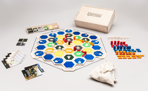 30.09.2016 - Wer nicht mit dem Catan-Standardmaterial siedeln möchte und kein Exemplar der 3D-Edition abstauben konnte, greift oft selbst zu Gips, Pinsel und Werkzeugkasten, um seinen Partien das gewisse Etwas zu verleihen. Doch nicht jeder hat dafür die nötige Zeit oder das Geschick. Alle, die auf der Suche nach einer etwas anderen Catan-Ausgabe sind, können sich ab morgen bei einer neuen Kickstarter-Kampagne von zwei Holztechnologie-Studenten aus Ravensburg einklinken: Die beiden wenden ihr akademisch erworbenes Know-how bei "WoodenCatan" an, einer Siedler-Version, die Holz statt Kunststoff einsetzt und sich einer angenehm reduzierten Bildsprache bedient. Mit einem Zielbudget von 26.000 € sollen 300 Spiele produziert werden, was rein rechnerisch auf jeden Förderer 86,67 € kommen ließe. Neben Komplettspielen ab einem Frühbestellerpreis von 85 € gibt es allerdings auch für weniger Geld eine Holzbox als Verpackung des normalen Grundspiels, das Spielmaterial einzeln ohne Box und die digitalen Vorlagen zum Selberbauen. Einen Gewinn wollen die Planer nicht machen, sondern haben mit dem Catan-Verlag Kosmos abgesprochen, dass 5 % der Einnahmen an das gemeinnützige "Childaid Network" gehen, ein Kinderhilfswerk, das sich vor allem in Südasien engagiert. 87 % sind für die Fertigung einkalkuliert, 8 % als Gebühren für die Kickstarter-Plattform. Weitere Infos finden sich auf der dazugehörigen facebook-Seite.