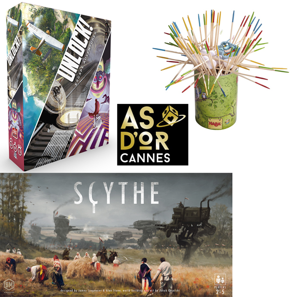02.03.2017 - Auf dem Spielefestival in Cannes wurden die drei Sieger des Jurypreises As d'Or bekannt gegeben. Den Hauptpreis als französisches Spiel des Jahres durften Cyril Demaegd, Thomas Cauet und Alice Carroll für Unlock in Empfang nehmen, verlegt von Space Cowboys; es bedient mit einer eigenen App den Trend der "Escape Room"-Spiele und lässt den Teilnehmern nur eine Stunde Zeit, um sich durch das Lösen von Aufgaben aus einer misslichen Lage zu befreien. Außerdem nominiert waren Codenames von Vlaada Chvátil, Imagine von Shingo Fujita / Motoyuki Ohki / Hiromi Oikawa und Kingdomino von Bruno Cathala.