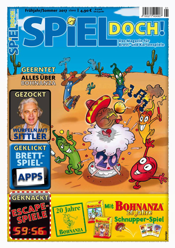 22.03.2017 - Übermorgen, am 24.3., erscheint die erste von zwei SPIEL DOCH!-Ausgaben dieses Jahres, in der Gelegenheitsspieler und Spiele-Einsteiger wieder jede Menge lesenswerter Rezensionen und anderer Beiträge finden. Besondere Aufmerksamkeit schenkt die Zeitschrift diesmal dem Dauerbrenner Bohnanza, indem sie dessen Geschichte beleuchtet; wer ihn selbst noch nicht ausprobiert hat, bekommt dazu mit dem beiliegenden Schnupperspiel Gelegenheit. Udo Bartsch, Britta Törpe und Andreas Becker setzten sich zu einer Spielrunde mit Schauspieler Walter Sittler ("Nikola", "Der Kommissar und das Meer") zusammen. Was sie selbst in ihrer Kindheit spielten, verrieten uns die Autoren Wolfgang Kramer, Uwe Rosenberg, Heinrich Glumpler sowie Inka und Markus Brand. Natürlich ist das Heft wie immer auch über unseren Shop erhältlich.