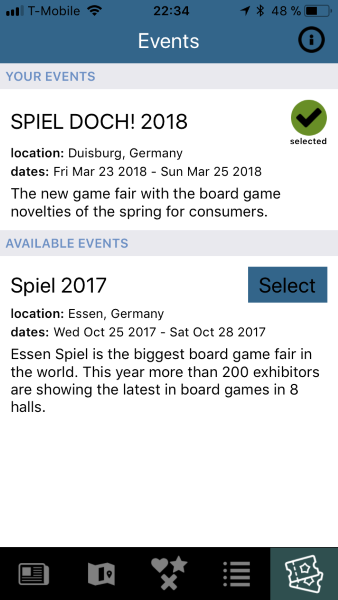 A digital omnivore makes attending the upcoming game fair SPIEL DOCH! on March 23-25 in Duisburg easier: with the free app "Event Badger" for Android and iOS visitors always know which exhibitor can be found where in the hall, when events take place, and which publisher offers which games. Every user can tag novelties he / she has already seen or still wants to see, and flag them as interesting or uninteresting. The list also contains data such as booth numbers, authors and other details provided by our partner spielen.de. All users who have already organized their visit of SPIEL in Essen with this program can (after completing an update) comfortably switch the Event Badger from that show to SPIEL DOCH!, as depicted in the screenshot.