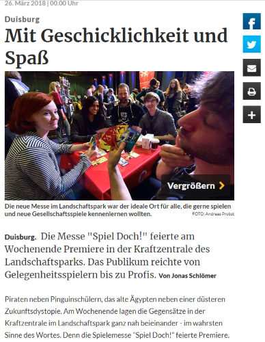 04.04.2018 - Beim Publikum war die erste SPIEL DOCH! in Duisburg am 23.-25.3. ein voller Erfolg. Groß war die Resonanz auch in den Medien: Eine Auswahl von Beiträgen aus Fernsehen, Radio, Tagespresse und Internet haben wir im Pressespiegel zur Messe zusammengefasst. Die nächste SPIEL DOCH! in Duisburg läuft vom 29. bis zum 31.3.2019.