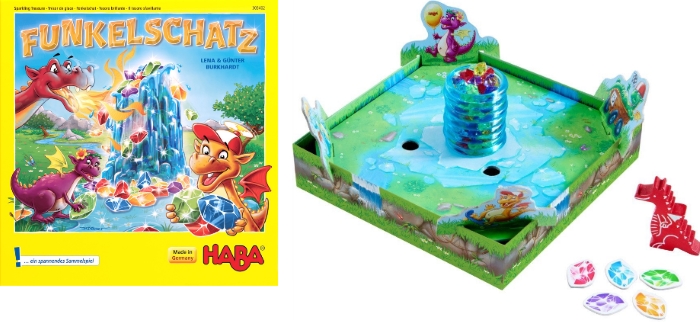 This morning, Funkelschatz by father Günter Burkhardt and his daughter Lena, published by HABA, has been awarded the jury prize Kinderspiel des Jahres as the year's best children's game. The jury explained its choice with the game's appeal for the whole family, the child-oriented story and the combination of keeping a cool head, luck and dexterity. A dragon dad melts a round ice tower layer after layer, releasing precious stones. Lena Burkhardt had the idea when she stacked curtain rings, removing one after another to let small blocks tumble out - treasure crystals in the finished game. Together, the Burkhardts had already developed Die Gärten von Versailles in 2017. The two other nominees were Emojito by Urtis Šulinskas (Huch!) and Panic Mansion by Asger Sams Granerud and Daniel Skjold Pedersen (Blue Orange / Asmodee).