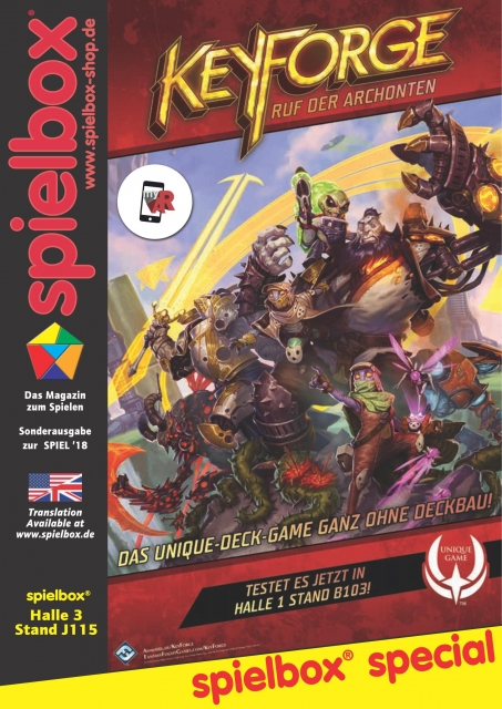 Ab sofort sind die "Augmented Reality" (AR)-Einbindungen im spielbox-special scharf geschaltet. Wer die App bereits heruntergeladen hat, muss nun nur ein Update machen. Im special findet sich AR auf der Titelseite (Keyforge) und auf der Rückseite (X-Code, dort fehlt leider der AR-Hinweis), im Heft selbst auf der Messeanzeige der SPIEL DOCH! in Duisburg 2019.