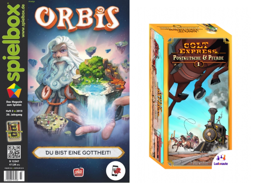 As an add-on the card "watchdog" for the game "Werwölfe" (Pegasus) is enclosed. Additionally we have a very special offer for all spielbox subscribers: full subscribers (uncancelled) to spielbox receive the expansion "Stagecoach and Horses" for Colt Express by Ludonaute/Asmodee at the price of only 1 Euro plus shipping by mentioning their subscription number (on the magazine's adress label or on the invoice, 7 digits, starting with 3, 6 or 7) in the order at our shop.