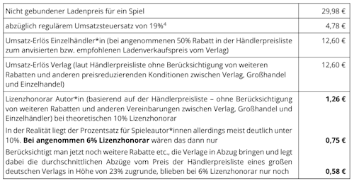 In einer Kalkulation, für die jeweils bei einem angenommenen Verkaufspreis von 29,98 € ein Honorar von 10 % an die Urheber geht, würde dies für Bücher eine Vergütung von 2,80 € je Artikel ergeben, für Spiele jedoch nur 1,26 €. Allerdings fallen Honorare für Spieleautor/innen laut SAZ in der Regel noch niedriger aus, da eine Beteiligung meist deutlich unter 10 % liege und die Verlage weitere Abzüge geltend machten. So zögen vor allem mittlere und größere Spieleverlage zusätzlich von ihrem Nettoumsatz noch andere, dem einzelnen Spiel nicht zurechenbare "Jahresboni und Werbekostenzuschüsse an Händler, anteilige TV-Werbekosten, Delkredere-Versicherungen, Transport- und Verpackungskosten sowie als nebulöser Zusatz ,und ähnliche Kosten'" ab, wodurch ein Spielehonorar um bis zu 80 % geringer ausfallen könne als das Entgelt für ein verkauftes Buch. Als ein Beispiel für derartige "Sonderabgaben" erwähnt das Papier den Versuch eines großen Verlags, Autor/innen einen Teil der Kosten für die Schaltung von Fernsehwerbung aufzubürden, wodurch das Lizenzhonorar etwa von 6 % auf 5 % schrumpfen würde.