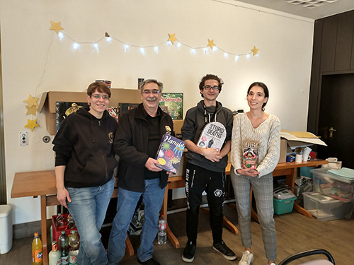 Christian Wallisch, Präsident des Ali Baba Spieleclubs, kommentierte: „Uns ist wichtig, dass die Einrichtungen den Kindern und Jugendlichen auch etwas an die Hand geben können und eine sinnvolle Beschäftigung anbieten können.“ Vor allem in der dunklen und kalten Jahreszeit seien Gesellschaftsspiele ein schöne und für die Kinder und Jugendlichen gern genommene Freizeitbeschäftigung. Man hoffe, damit ein klein wenig helfen zu können, zumal die Schäden immer noch überall sichtbar seien und es sicher lange dauern werde, bis wieder Normalität ins Ahrtal einkehre, so Wallisch. Das Bild zeigt von links Astrid Konzen und Christian Wallisch, die die Spiele bei der Okuja an Benedikt Groß und Qendresa Cukaj übergaben.(th)
