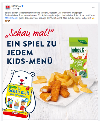 19.11.2021 - Beim "Happy Meal" von Mc Donald's funktioniert die Kombi aus Menü und Spielzeug schon ewig, doch eine andere Schnellrestaurant-Kette - Nordsee - legt ihren Kindermenüs seit Ende Oktober ein ganzes Kinderspiel bei: In 240 deutschen und österreichischen Filialen bekommen Kunden gratis ein Exemplar von Schau mal! dazu, ein Spiel des Halli Galli-Erfinders Haim Shafir, das 2015 auf der Empfehlungsliste zum „Kinderspiel des Jahres“ war. Im Handel kostet das Spiel sonst immerhin knapp 8 €.