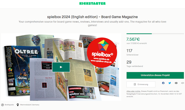 13.10.2023 - In 2019, we started our first successful crowdfunding campaign to finance the continued development of the English edition of spielbox, securing the budget for new ideas, expanding our subscriber numbers and in turn making the magazine even more attractive for the inclusion of publishers' add-ons. Within the next 29 days, everyone can now support the English spielbox with its latest Kickstarter campaign: single copies with or without special promos are available as well as trial, one- and two-year subscriptions to the print and / or digital edition.