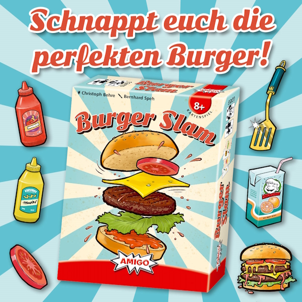 Unter Zeitdruck versuchen beim Kartenspiel Burger Slam (ca. 10,99 €) von Christoph Behre alle, die schmackhaftesten Burger aus Brötchenhälften, Käse, Tomaten und Salat zusammenzustellen, während eine wahre Flut von Bestellungen auf sie einprasselt.