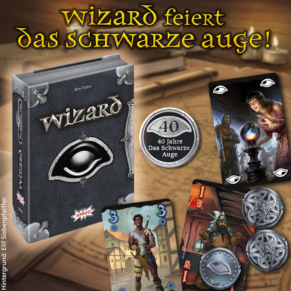 Den spielerischen Herbst läutet Amigo im September mit sieben Produktneuheiten ein. So kombiniert Wizard – Das Schwarze Auge: Abenteuer in Aventurien (Preisempfehlung 19,99 €) von Ken Fisher das bekannte Wizard-Spielsystem mit Themen aus Das Schwarze Auge, der bekanntesten deutschen Rollenspielwelt, die aktuell ihr 40. Jubiläum feiert. Der Fantasyautor Ulrich Kiesow hatte DSA 1984 erstmals bei Schmidt Spiele veröffentlicht.