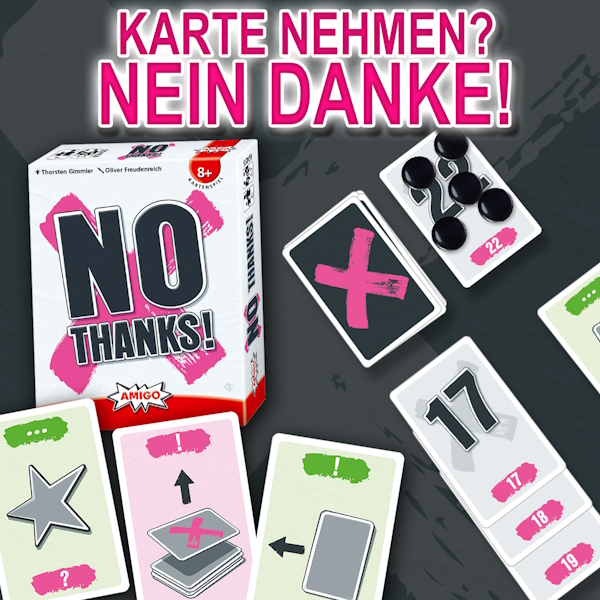 Auch Ablehnungen können zum Sieg führen, zumindest bei No Thanks! (ca. 10,99 €) von Thorsten Gimmler: Man darf hier zu Karten "nein danke!" sagen, die Minuspunkte bringen, aber nur solange man genug Spielsteine hat. Amigo legte hier das Kartenspiel Geschenkt neu auf und erweiterte es um neue Sonderkarten.