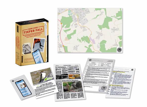 06.04.2022 - Angesichts der Nachrichtenlage könnte man meinen, zum Zwecke des Eskapismus setzten die Menschen nur noch auf gewaltfreie Rosamunde-Pilcher-Geschichten. Weit gefehlt - außer in Büchern und Filmen erfreuen sich Krimi-Themen nämlich auch in Spielen großer Beliebtheit. Eine April-Neuheit erscheint im Gmeiner-Verlag und wird vertrieben über Hutter Trade: Als Teil der Dark Cases-Reihe inszeniert Tiefer Fall von Tobias Kühnlein und Mona Dengler ein realistisches Verbrechen im verschlafenen Örtchen Dennsberg, wo der Chef eines Suppenherstellers bei einer Klettertour in den Bergen verunglückt ist. Allerdings mehren sich Indizien, dass hinter dem Unfall etwas ganz anderes stecken könnte. Alleine oder in einem bis zu sechsköpfigen Team ermitteln die Spieler, indem sie Dokumente, Vernehmungsprotokolle und Zeugenaussagen auswerten. Welche Spuren hat die Polizei gefunden, und sind die Alibis stichfest? Wer hat ein mögliches Motiv? Das Spielmaterial lässt sich (anders als bei Legacy-Spielen) mehrfach verwenden. Um mitschnüffeln zu können, braucht man einen Internetzugang. Die Preisempfehlung liegt bei 18 €, einen Video-Trailer gibt es hier.