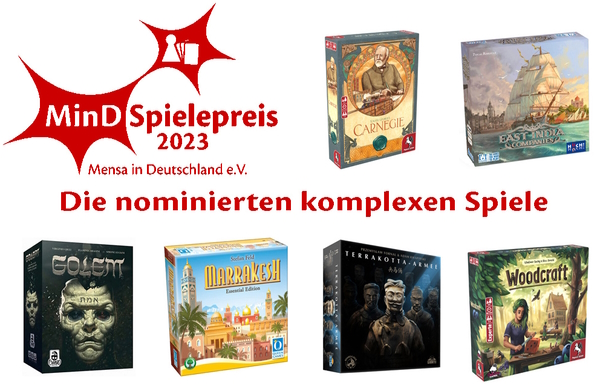 17.05.2023 - Nach den Zwei-Spieler-Titeln und jenen mit kurzer Spieldauer steht jetzt auch die dritte Kategorie mit Nominierten für den MinD-Spielepreis des Hochbegabtenvereins Mensa in Deutschland fest. Im Rennen um die Auszeichnung für die besten komplexen Spiele sind ein halbes Dutzend Ideen für alle, die spielerisch gern mal dickere Bretter bohren.