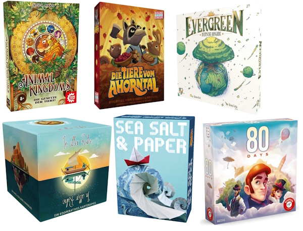 Six other creatives make up the category of most beautiful graphics in family games: Katy Grierson with Animal Kingdoms (author: Steven Aramini / publisher: Game Factory), Shawna J.C. Tenney with Creature Comforts (Roberta Taylor / Board Game Circus), Wenyi Geng with Evergreen (Hjalmar Hach / HeidelBär Games, Horrible Guild), Tristam Rossin with Tranquility (James Emmerson / Board Game Hub), Pierre-Yves Gallard and Lucien Derainne with Sea, Salt & Paper (Bruno Cathala, Théo Riviére / MM-Spiele), as well as Felix Wermke with 80 Days (Emanuele Briano / Piatnik).