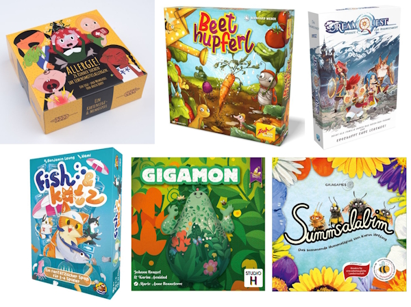 This time, the following illustrators made it into the category of most beautiful graphics in children's games: Anita Barry with Allergie (designer: Anita Barry / publisher: Allergie, ein Kinderspiel), Stefanie Reich with Beethupferl (Bernhard Weber / Zoch), Yann Thomas with DreamQuest (Fabien Vincourt / Space Cow), Hami with Fish & Katz (Benjamin Leung / HeidelBär Games), Marie-Anne Bonneterre with Gigamon (Karim Aouidad, Johann Roussel / Mirakulus), which was just nominated for "Kinderspiel des Jahres", and Nicole Pustelny with Summsalabim (Karin Hetling / Gaia Games).