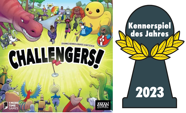 The gray Kennerspiel des Jahres (connoisseur's game of the year) trophy is aimed at experienced players who can cope with more complex rules. This time, Challengers! by Johannes Krenner and Markus Slawitscheck came out on top, borrowing "autobattle" and "capture the flag" mechanics from computer games, published by Z-Man Games / Asmodee. The jury: "Challengers offers a new, fresh concept that turns games night into an exciting and action-packed event, all the way through to the final duel between the two best players. Large groups in particular will enjoy the charged tournament atmosphere, created as players continuously take on new foes and personal rivalries grow. The variety of possible combinations makes this challenge a real pleasure, with a high level of replayability."