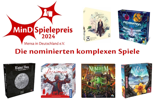 26.04.2024 - Nach den "kurzen" und Zwei-Personen-Spielen hat der Hochbegabtenverein Mensa in Deutschland jetzt auch die Nominierten für seinen MinD-Spielepreis in der Kategorie "komplexe Spiele" bekannt gegeben. Mit ausgefeilten Mechaniken und strategischem Tiefgang dürften diese sechs Titel selbst für die cleversten Vielspieler eine reizvolle Herausforderung sein. Bis Ende des Jahres können Mensaner nun ihren Lieblingstitel unter den folgenden sechs Nominierten wählen:
