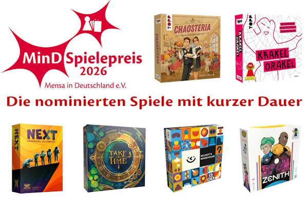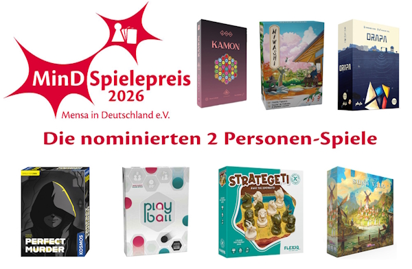 01.04.2026 - Nach den Expertenspielen hat die Hochbegabtenorganisation Mensa in Deutschland (MinD) jetzt auch die übrigen Nominierten für den diesjährigen MinD-Spielepreis veröffentlicht.