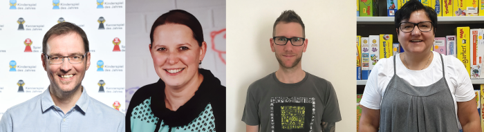 The Kinderspiel des Jahres of 2019 has already been chosen, but next year a new juror and new advisory committee members will determine the winner. Tina Kraft, a member of Spiel des Jahres e.V. since 2008 and part of the jury since 2009, will resign at the end of July, as will committee members Cordula Dernbach and Gaby Kaufmann. Hauke Petersen, 45-year-old newspaper editor and games critic who has already been part of the advisory committee, will take over Kraft's place on the jury, also joining the association. The Kinderspiel des Jahres committee mandates had been publicly announced for the first time, resulting in almost 50 applications; in August, educator Carolin Pletsch (38) from Koblenz, day care center director Arne Proctor (34) from Ingolstadt and Sigrid Wood (51), president of a game library in Romanshorn / Switzerland, will begin their work. The photo shows (from left to right) Petersen, Pletsch, Proctor, and Wood.