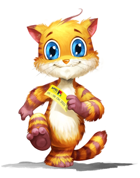 28.06.2023 - Neben einem neuen Logo und einer überarbeiteten Hallenaufplanung wird es für die nächste SPIEL am 5.-8.10. auch ein neues Maskottchen geben: Eine orange getigerte Katze mit großen blauen Augen, gestaltet von Illustrator und Autor Michael Menzel (Die Legenden von Andor), begleitet künftig als Design die wichtigste Brettspielmesse der Welt. Laut Carol Rapp, Chefin des SPIEL-Veranstalters Merz Verlag, fiel die Wahl auf den Stubentiger, weil Katzen wie kaum ein anderes Tier fürs Spielen stehen; sie legten sich in Spieleschachteln, seien neugierig und verspielt und lösten Emotionen aus. Mit einem Tier verbinde man außerdem mehr als mit einem Tangram, dem Puzzle aus dem Logo der Messe; wie Rapp weiter erklärte, möge der Merz Verlag das Logo zwar sehr, aber niemand sage "Oh, wie niedlich" oder wolle es kuscheln und damit spielen.