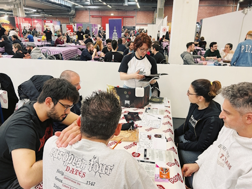 Die Halle B auf dem Gelände der Messe Modena widmet sich Rollenspielen. Anlässlich des 50. Jubiläums des Genrebegründers Dungeons & Dragons läuft das diesjährige Festival unter dem Motto "Role Playing, Storytelling and Experience": Besondere Schwerpunkte sollen darauf liegen, welche Bedeutung Rollenspiele und das Spielen in der Gesellschaft haben, wie Spiele als Erzählmedium dienen und was man nebenbei lernen kann. Das Ereignis möchte so alle Rollenspiele feiern. Ehrengast ist David "Zeb" Cook, der die erste "Blue Box" von Dungeons & Dragons mit stilprägenden Regelwerken und Geschichten schuf; andere Arbeiten aus seiner Feder erschienen zum Beispiel für die Adventures of Indiana Jones oder Conan the Barbarian. Wie die Messe schreibt, bevorzugt Cook dabei überschaubare Regeln und regt die Vorstellungskraft von Spielern und Spielleitern an, um einzigartige Spielerfahrungen zu ermöglichen. Auf einem großen Tischdisplay zeigt das Spielefest D&D mit Spielmaterial aus mehreren Editionen, verbunden durch eine zusammenhängende Inszenierung, bei der frühere Aktionen die Zukunft beeinflussen.
